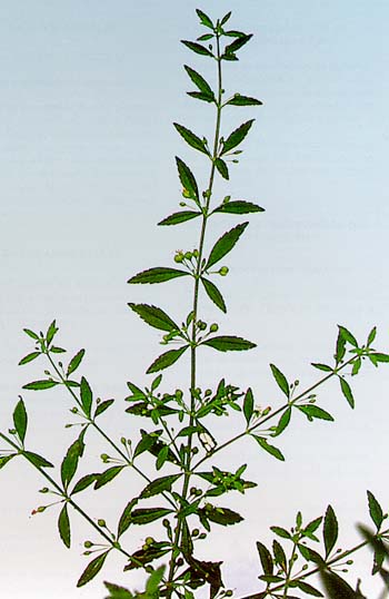 Descripción botánica: Planta herbácea erecta de hasta 50 cm de alto, tallos glabros. Hojas hasta 5 cm de longitud, oblanceoladas u ovadas, pecioladas, obtusas en el ápice, cuneadas en la base, poco nervada pinnadamente, de 2,5 cm de largo por 1 cm de ancho, bordes aserrados. Flores con corola blanca, cáliz con sépalos de 2 mm de largo. Fruto globoso de 3 mm de largo.
