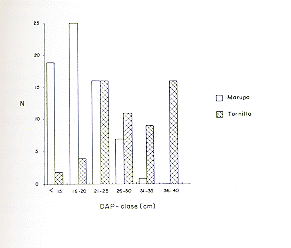 Hasta antes del ingreso de los búfalos, tornillo mostraba en las plantaciones 411 a 414 un buen prendimiento, pero plantas poco vigorosas con follaje amarillento, y un crecimiento inferior al de marupá sobre suelo compactado.