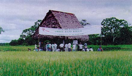 Es común pensar que las lluvias en la selva pueden proporcionar todos los requerimientos de agua del cultivo de arroz en pozas. Aún en una zona con 2, 100 mm de precipitación anual, el riego suplementario bombeado del río aumenta los rendimientos en un promedio de 40% en Yurimaguas y los mantiene mucho más estables (ver Cuadro 3).