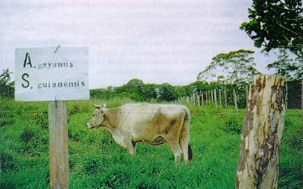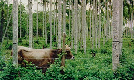En una plantación de pijuayo para la producción de fruto, que fue desmontada previamente con bulldozer, se sembró como pasto la leguminosa Centrosema macrocarpum. Se aplicaron 20 kg de P y K por hectárea para asegurar un buen establecimiento y persistencia del pasto. Dieciocho meses después de la siembra se inició el pastoreo, con una carga inicial de 3.3 cabezas/ha; pero a causa de la disminución de forraje disponible en la época seca, la carga animal se redujo a 2.3 cabezas/ha.