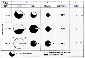 LEFT Mineralogía de arcillas. La arcilla fue separada tal como se indica en el análisis del tamaño de partículas. Entre 10 y 20 mg de arcilla fueron analizados según la t6cnica de "láminas orientadas", usando el difractómetro Philips.
