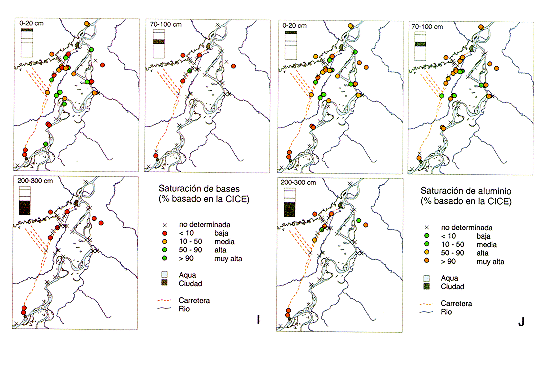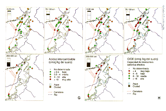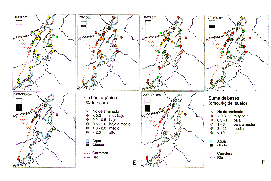 Cada característica del suelo fue evaluada con una escala interpretativa de tres a seis clases, indicadoras del grado de limitancia de la característica, Las fronteras de clase (los limites de clases) de las escalas interpretativas se dan en las mismas unidades químicas de la característica motivo de evaluación. Las escalas interpretativas de las características químicas evaluadas, fueron las siguientes: Carbón organico (kg kg-1 102) <0.2 muy bajo; 0,2-0,5 bajo; 0,51,0 bajo a medio; 1,0-2,0 medio; >2,0 alto. Acidez pH-H20 <4,5 extremadamente Acido; 4,55,0 fuertemente ácido; 5,0-6,0 ligeramente Acido; 6,0-7,0 neutro; 7,0-8,0 ligeramente alcalino; >8,0 alcalino. CIC efectiva (CICE, cmolc kg-1 del suelo) < 4 muy baja; 4-8 baja; 8-16 media; >16 alta. Suma de bases (cmolc kg-1 del suelo) <0,3 muy baja; 0,3-1,0 baja; 1,0-3,0 baja a media; 3,0-10 media; >10 alta. Saturación de bases (%, basado en la CICE) <10 bajo; 10-50 medio; 50-90 alto; >90 muy alto. Saturación de aluminio (%, basado en la CICE) <10 baja; 1050 media; 50-90 alta; >90 muy alta. Acidez intercambiable (cmolc kg-1 de suelo) <0,5 baja; 0,5-4,0 media; 4,0-10,0 alta; 10,0-17,0 muy alta. Fósforo disponible (mg kg-1 de suelo) -OLSEN <15 bajo; 15-50 medio; >50 alto. Limo (kg kg-1 102) <10 muy bajo; 10-20 bajo, 20-40 medio; >40 alto. Arcilla (kg kg-2 102) < 5 muy baja; 5-15 baja; 15-40 media; >40 alta.