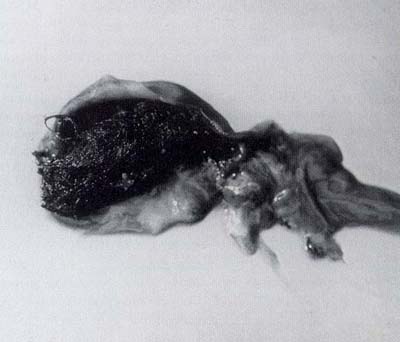 A 21 month-old female identified as F-37 presented with weight loss, sparse and short hair coat, lethargy, and anorexia. The animal died a few hours after being placed in an intensive-care incubator. At necropsy, a similar mass as described in case one was found in the stomach and extending into duodenum. The mass measured three centimeters in width and six centimeters in length. It consisted of matted hair (Fig. 1).