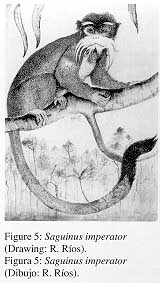 Pelaje en general de color pardo-grisáceo, de aspecto lustroso, fino y corto. Pelos con la.banda subterminal dorado o anteado. Frente, arcos superciliares y laterales de la cara de color oscura contrastando con la coronilla pardo-plateada. Banda circumbucal despigmentada (color carne) y con pelos blanquecinos; bigotes igualmente blanquecinos, extremadamente largos y orientados hacia abajo o hacia atrás. Regiones dorsales y laterales del tronco pardo-grisáceas. Zona ventral del tronco y de las extremidades predominantemente de color pardo-anaranjado. Cola de color anaranjado-rojizo y matizado con gris. S. imperator está representada en el Perú por las subespecies S. i imperator y S. i. grisescens. La diferencia mas notable entre estas dos es la orientación de los bigotes: así, en la primera los bigotes están orientados hacia atrás, mientras que en la segunda la orientación es hacia abajo. Mayor información sobre la diagnosis de la especie se encuentra en HERSHKOVITZ (1977, 1979a). |