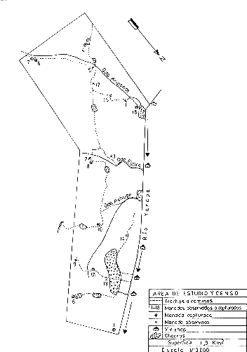 Censar un grupo de monos requiere la observación visual del mismo, pero a menudo la detección inicial es más bien por señales auditivas. Cuando no fue posible el conteo de los integrantes de un grupo, se estimó el tamaño aproximado en base a indicios como el movimiento de follaje durante el alejamiento del grupo, vocalizaciones, etc. Aparte de las observaciones de campo, inquirí a los lugareños empleados como guías sobre ubicación de poblaciones de Cacajao y de otras especies, como también sobre otros tópicos relacionados con la ecología y situación de los primates locales. Todos los censos se hicieron fuera de reservas protegidas, por lo tanto la presión de caza afectaba a las poblaciones en estudio, motivo por el cual la mayoría de los monos eran tímidos y difíciles de observar. Trabajé sólo en mis dos áreas principales de estudio. Con 1. Constable, R. Mittermeir durante los recorridos y censos iniciales, y con P. Soini, en las inmediaciones del Río Blanco, durante todos los censos y recorridos a pie y en bote.