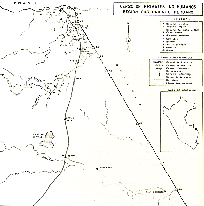 Los censos y evaluaciones verifican la distribución de las especies y proporcionan las densidades poblacionales comparativas, que nos permiten determinar las áreas apropiadas para las sacas, así como programar las sacas simultáneas de otras especies que ocupan las mismas áreas. Así, Saguinus mystax se distribuye en la margen derecha de los Ríos Ucayali y Amazonas, y margen izquierda del Río Yavarí (Hershkovitz 1977); S. labiatus ha sido registrado solamente al Este de Iberia e Iñapari, entre los ríos Acre y Tahuamanu, en Madre de Dios (Encarnación et al. este volumen); Saimiri spp. presenta 2 tipos distinguibles (arcos gótico y romano). Al primero, se le localiza en la margen izquierda del Marañón y Amazonas, y el segundo en la margen derecha e izquierda del Río Ucayali; Saguinus fuscicollis, y sus diferentes subespecies, ocupan todo el ámbito de la Selva Baja (Hershkovitz 1977), generalmente se encuentra asociada con S. mystax, así como con S. labiatus.