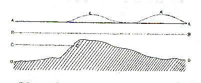 El diagrama anterior muestra con mayor claridad el modo en que supongo que se forma la ola. AA representa el nivel del agua cuando no hay marca; DD el fondo del río; BB la profundidad a la que el agua se pone en movimiento con las marcas bajas, no llegando tan al fondo del río hasta el bajío C, por lo que no se forma una ola, sino sólo una corriente rápida; CC, es la profundidad a la que el agua se pone en movimiento con las mareas altas, cuando la masa, entrando en contacto con el fondo en C, se ve elevada y forma una ola en E, ola que es propagada río arriba. Parece ser, por tanto, que para producir esa ola debe existir alguna formación peculiar en el fondo, y no un mero estrechamiento y ampliación en un río sometido a marcas; de otro modo, se produciría con una frecuencia mucho menor. Se dice que en el Mojú y Acarrá se produce el mismo fenómeno; y como todos estos ríos son paralelos entre sí es probable que el mismo lecho rocoso los cruce, produciendo en todos ellos un bajío similar. También se puede ver fácilmente la razón de que sólo haya una ola y no una sucesión de ellas; cuando la primera ola ha pasado, el agua ha ascendido tanto que ahora la corriente fluye muy por encima del bajío, y por tanto no se ve afectada por él.
