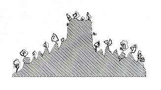 Este dibujo ilustra una sección de la montaña tal como puedo representármela. Las extraordinarias melladuras de las rocas no han sido exageradas en absoluto, y resultan más sorprendentes cuando se ven de cerca, pues desde lejos el aspecto es el de una colina llana recubierta por la selva, de altura no muy considerable, y de inclinación gradual, Además de las grandes cuevas y crestas que se muestran arriba, la superficie de cada precipicio se halla extraordinariamente serrada, formando simas de profunda pendiente, cortadas en la cara llana de la roca, u otras veces canales verticales, con bordes angulares, como se supone que podrían formarse cuando el granito, en un estado elástico, fuera empujado contra duras masas angulares.