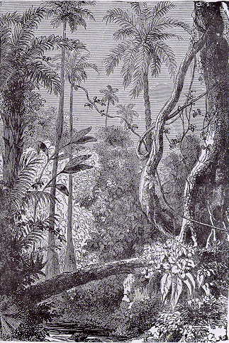 En una hondonada cercana a un pequeño torrente que cruzaba el sendero descubrí que crecía la palmera singular llamada "Paxiúba barriguda". Es un árbol hermoso, alto y bastante esbelto, con una copa de elegantes hojas rizadas. En la base del tallo, hay una masa cónica de raíces aéreas, de cinco o seis pies de altura, que se desarrolla en mayor o menor grado en todas las especies de este género. Pero el carácter peculiar del que deriva su nombre es que el tallo, a algo más de la mitad, se hincha de repente hasta doblar cuando menos su espesor anterior, para un poco más allá contraerse de nuevo y proseguir en su forma cilíndrica hasta la copa. Sólo cuando se ha visto gran número de estos árboles, en todos los cuales esta característica es más o menos discernible, puede creerse que no se trate una circunstancia accidental del árbol individual, en lugar de una auténtica característica de la especie. Se trata del Iriartea ventricosa de Martius.