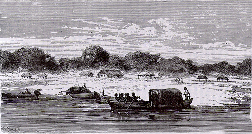 Hacia el mediodía dejamos este agradable lugar y proseguimos lentamente nuestro viaje. Uno de mis mejores indios enfermó de fiebres intermitentes; varios días después, la enfermedad atacó a otro. Era inútil tratar de conseguir hombres que me ayudaran durante el resto del viaje en cualquier sitio o pueblo; ninguna oferta de salarios extra les induciría a dejar sus casas; todos tenían como excusa alguna ocupación o enfermedad, por lo que nos vimos obligados a proseguir lo mejor que pudimos. Dos días antes de llegar a las cataratas compré una canoa más pequeña a un comerciante portugués para subir por el Uaupés y pasé a ella mi carga, dejando en la otra canoa la carga del Señor Lima para enviarla después. En Camanaú, con bastante dificultad y algún retraso, conseguí un piloto y otro indio para que me acompañaran hasta Sao Gabriel. Allí, tras otro día de retraso, conseguí a dos indios que aceptaron llegar hasta Sao Joaquim; y tras hacerme esperar tres o cuatro horas más de la fijada, huyeron por la noche del sitio donde dormíamos después de que les había pagado un salario doble por toda la distancia. Sin embargo, tuve aquí la suerte de conseguir tres que sustituyeran a los dos fugitivos; más como otro de mis indios había enfermado, no teníamos aún la tripulación suficiente para pasar por los numerosos rápidos y rocas que obstruyen el río.