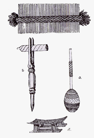 El uso de los distintos tipos de ornamento y joyas se limita casi exclusivamente a los hombres. Las mujeres llevan un brazalete en las muñecas, pero ninguno en el cuello y ninguna peineta en el pelo; llevan una liga por debajo de la rodilla, bien apretada desde la infancia con el propósito de hinchar la pantorrilla, lo que ellos consideran signo de gran belleza. Cuando danzan en sus fiestas, las mujeres llevan un pequeño tanga, o delantal, hecho -de cuentas hermosamente dispuestas; sólo tiene unas seis pulgadas cuadradas, y no lo llevan nunca en otra ocasión, quitándoselo nada más terminar la danza.