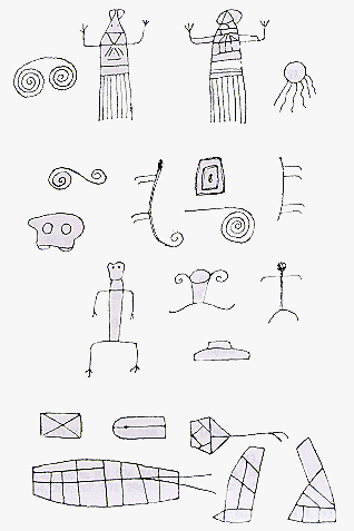 También en la desembocadura del Río Branco, en una pequeña isla rocosa del río, hay raspadas, en la dura roca granítica, numerosas figuras de hombres y animales de gran tamaño. Cerca de Santa Isabel, San Jozé y Castanheiro hay más figuras de este tipo, y encontré otras en el Alto Río Negro, en Venezuela. Hice unos dibujos cuidadosos de todas ellas, pero por desgracia los he perdido.